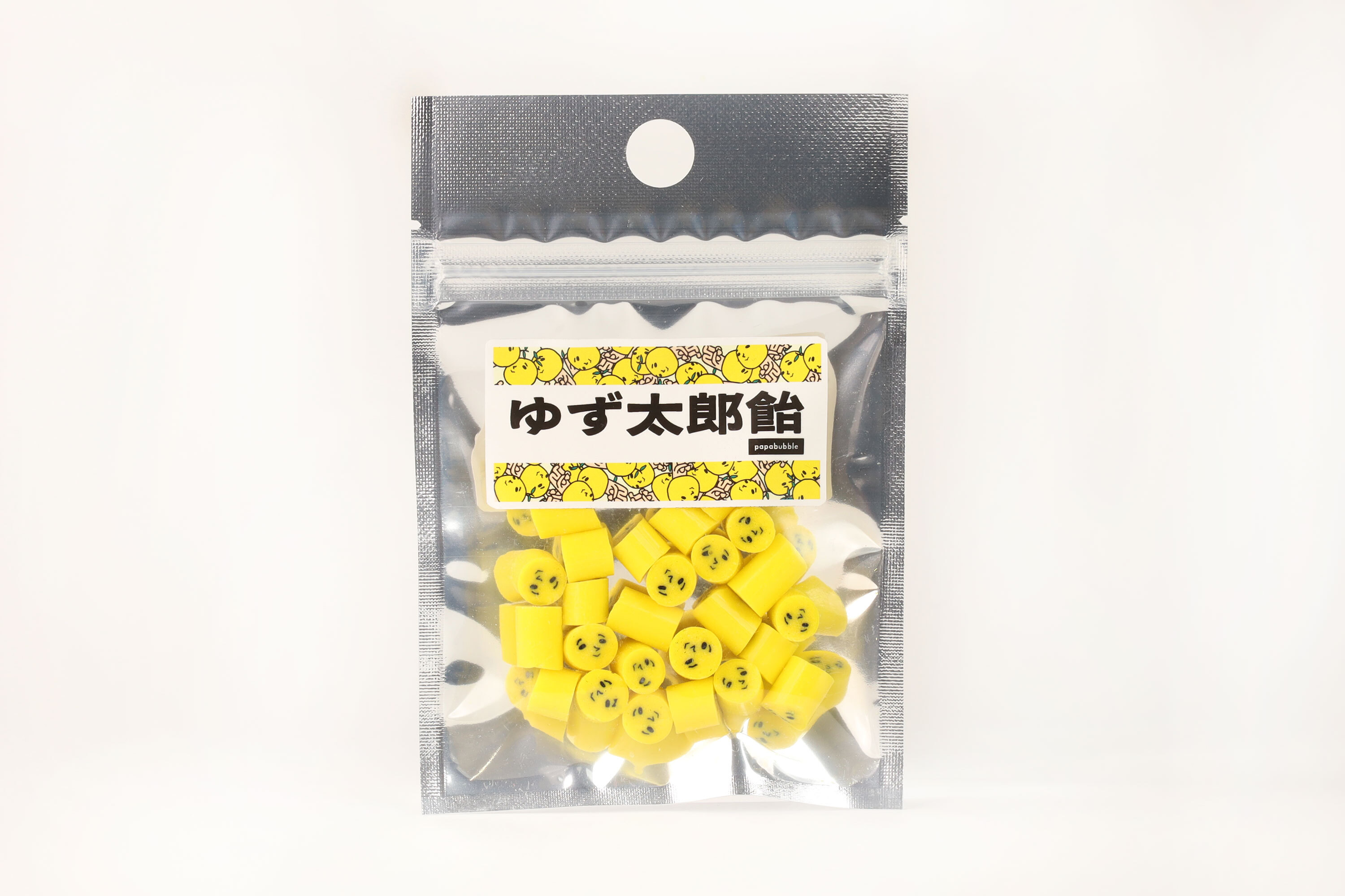 スペイン・バルセロナ発祥の人気アートキャンディショップ“PAPABUBBLE”とのコラボレーション。1cmほどの小さな粒の中に表現した「組み飴」の技術とジューシーな味わいが特徴で、今回のコラボではゆず太郎デザインの特別なキャンディが誕生。職人がひとつひとつ手作業で仕上げた、さわやかなゆず風味が楽しめるこだわりの一品です。